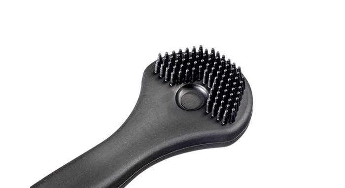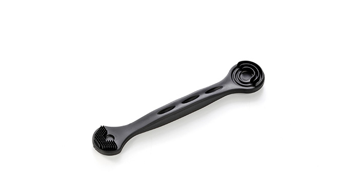採用特殊專利半圓弧與凸點刮除設計,且以矽膠材質一體成型製成,使用後可水洗且重量輕巧方便攜帶。